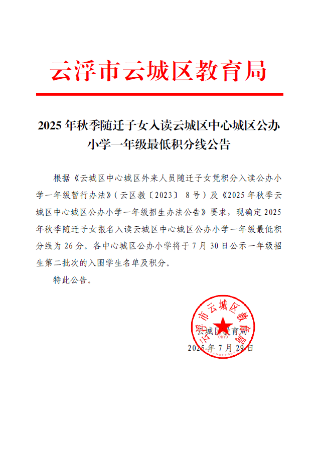2025年秋季随迁子女入读云城区中心城区公办小学一年级最低积分线公告