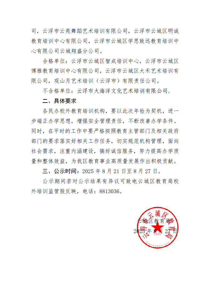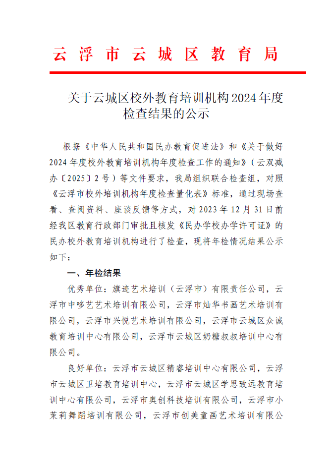 关于云城区校外教育培训机构2024年度<br/>检查结果的公示