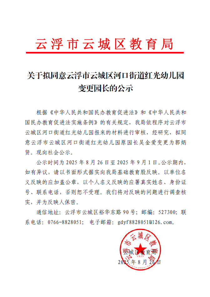 关于拟同意云浮市云城区河口街道红光幼儿园变更园长的公示