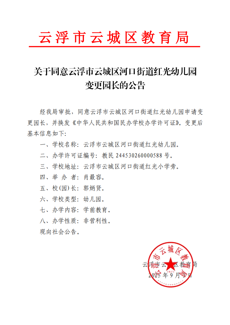 关于同意云浮市云城区河口街道红光幼儿园变更园长的公告
