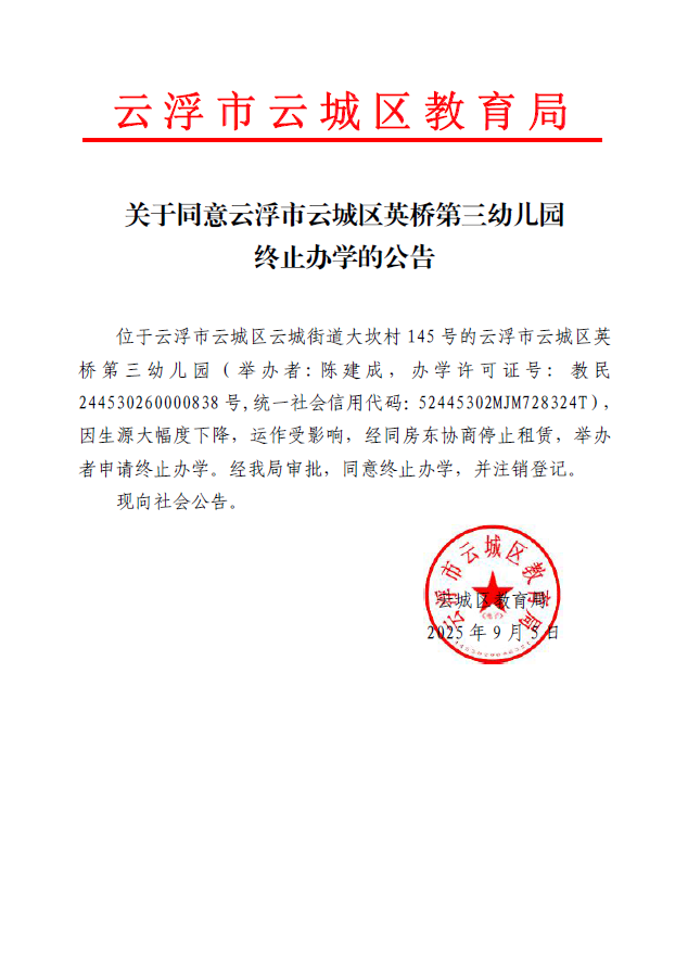 关于同意云浮市云城区英桥第三幼儿园终止办学的公告