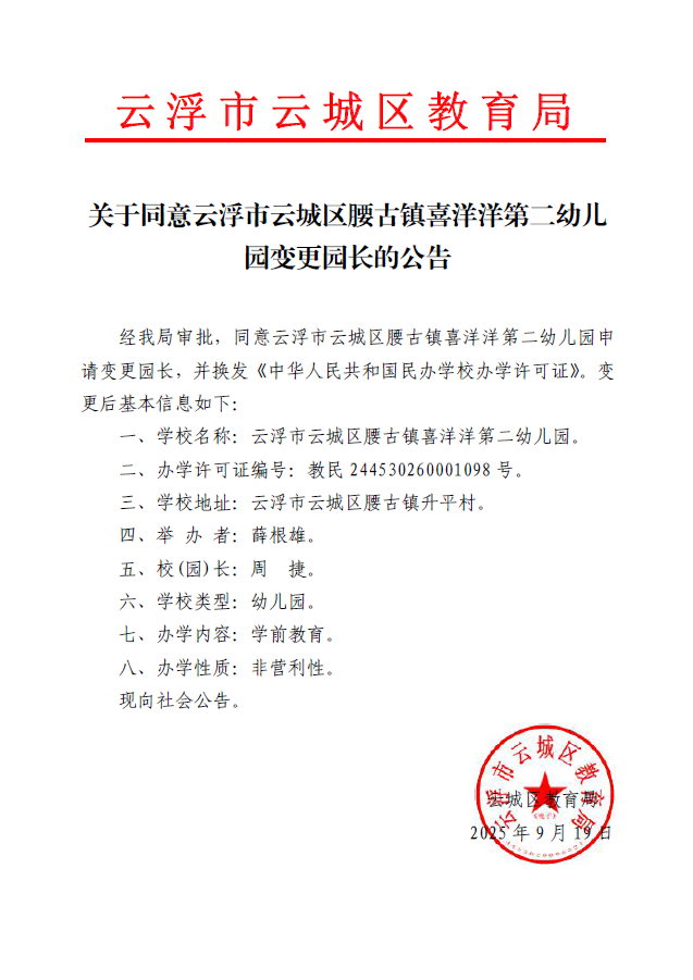 关于同意云浮市云城区腰古镇喜洋洋第二幼儿园变更园长的公告