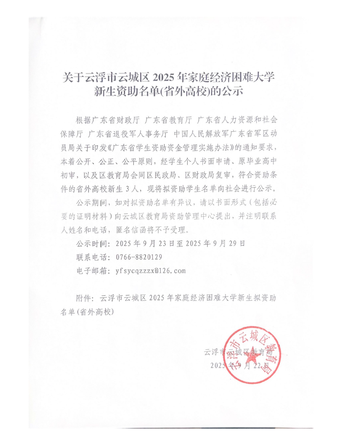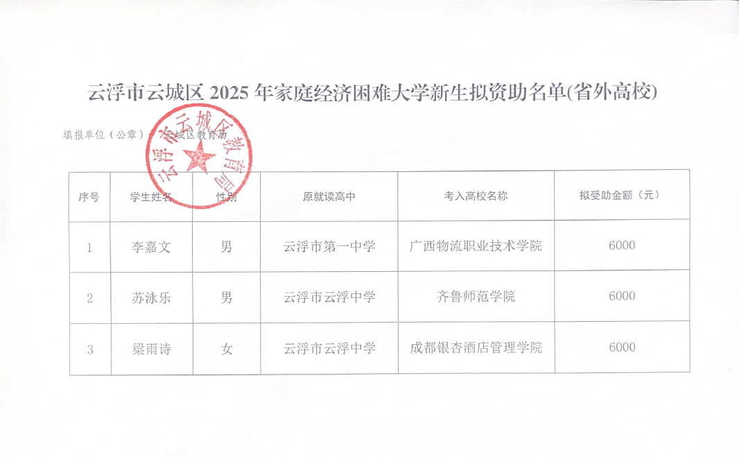 关于云浮市云城区2025年家庭经济困难大学新生资助名单(省外高校)的公示
