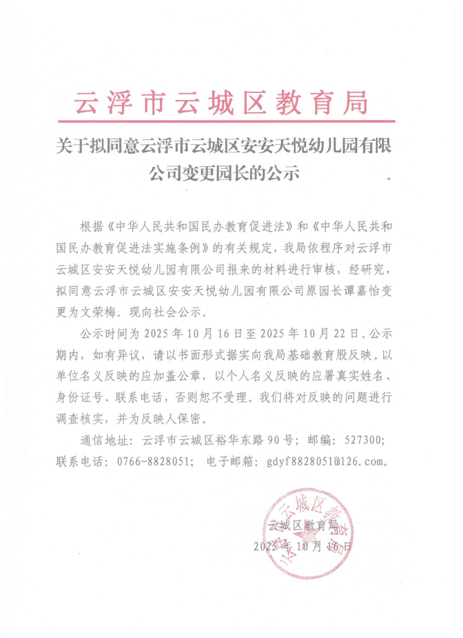关于拟同意云浮市云城区安安天悦幼儿园有限公司变更园长的公示