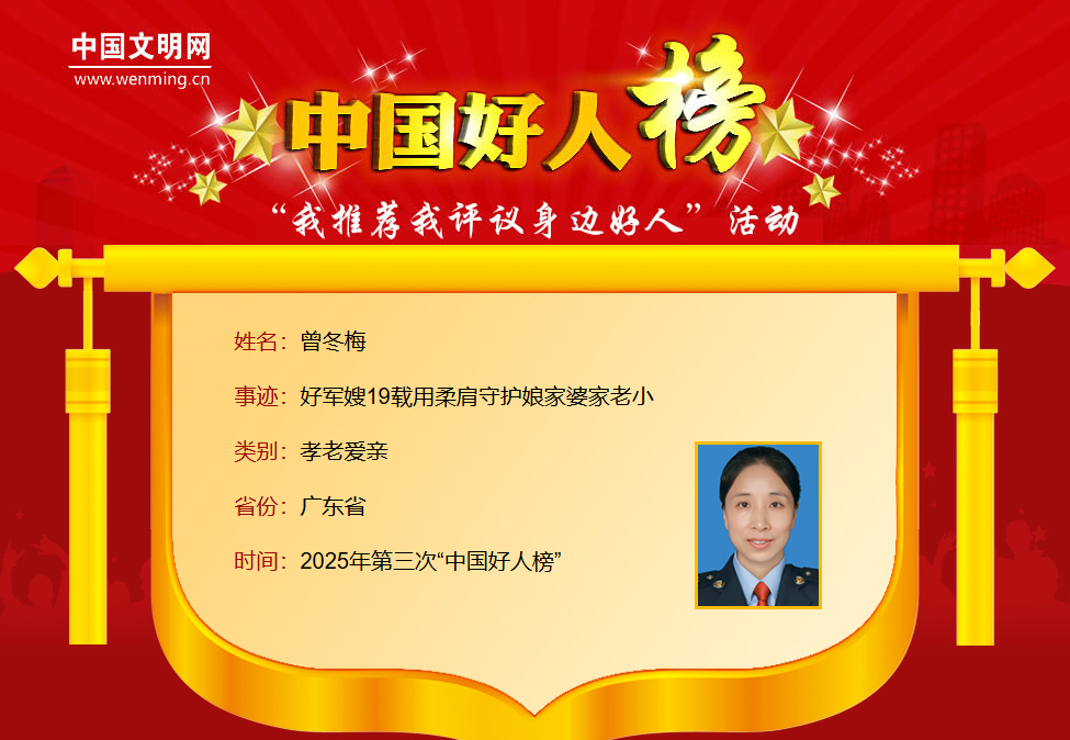 2025年第三次“中国好人榜”发布仪式暨全国道德模范与身边好人现场交流活动10月15日在新疆维吾尔自治区阿克苏地区举办。经各地推荐、网友评议和专家评审等环节,共有138名助人为乐、见义勇为、诚实守信、敬业奉献、孝老爱亲身边好人光荣上榜,其中,来自云浮的曾冬梅上榜孝老爱亲类“中国好人”。
