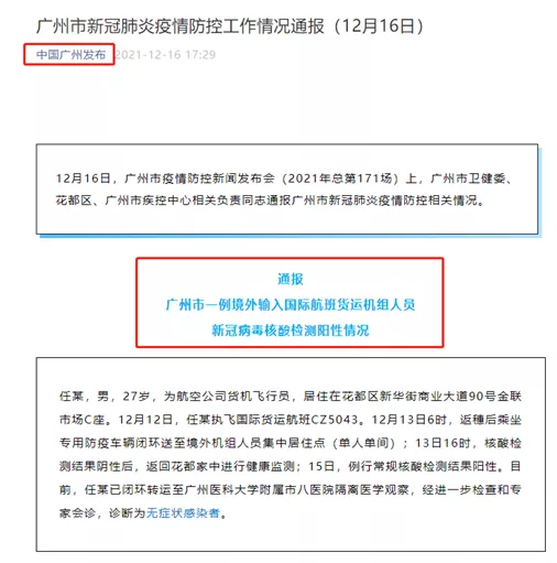 继广州市越秀区、白云区、东莞市大朗镇新冠病毒核酸检出阳性者后,12月16日凌晨,广州市花都区在对国际货运机组人员进行例行核酸检测中,发现1例新冠病毒无症状感染者。花都区已划定封控区为花都区金联小区C栋及紧邻的D栋,管控区为金联小区紫金苑,防范区为曙光大道、天贵路、新华路包围的区域。16日中午开始,花都区已启动全员核酸检测。