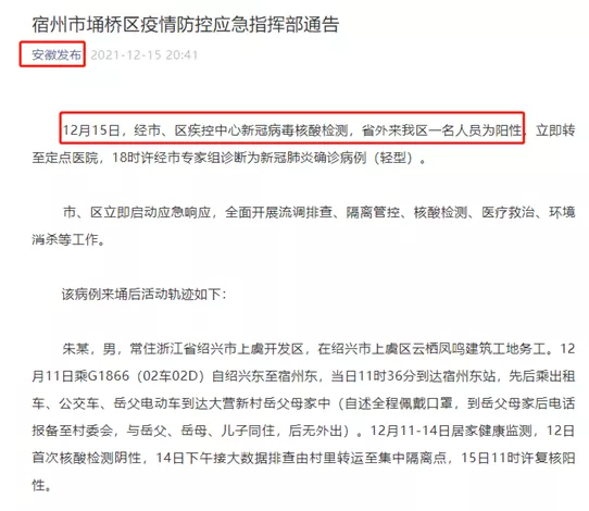 12月15日,安徽省宿州市新增1例本土阳性个案,为浙江省绍兴市来宿人员。