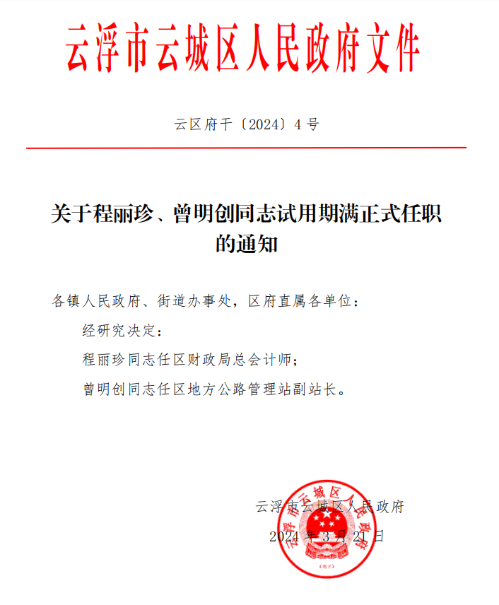 关于程丽珍、曾明创同志试用期满正式任职的通知