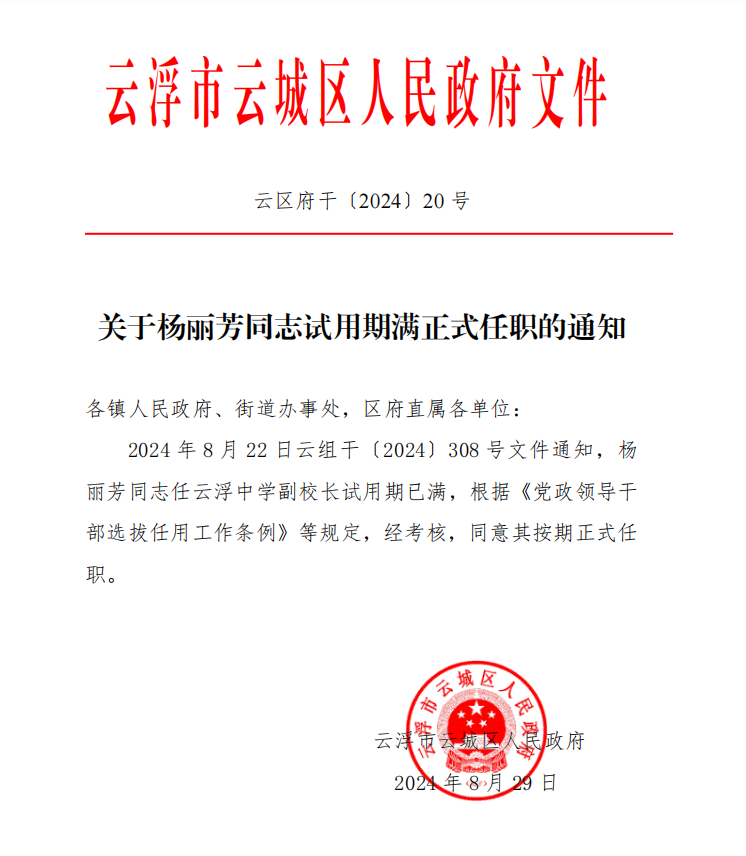 关于杨丽芳同志试用期满正式任职的通知