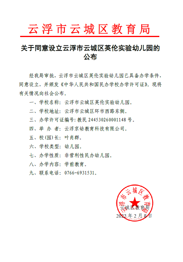 关于同意正式设立云浮市云城区英伦实验幼儿园的公布