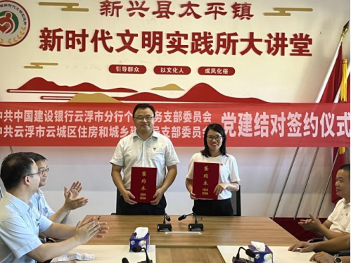 为深入贯彻习近平新时代中国特色社会主义思想和党的二十大精神,坚持以人民为中心的发展思想,进一步加强党的建设,强化党建引领,积极创新基层党建工作载体,提升党建带好队伍促进业务发展,2023年7月5日,中共中国建设银行云浮市分行个人业务支部委员会和中共云浮市云城区住房和城乡建设局支部委员会经友好协商,结成共建单位,并签订共建协议。