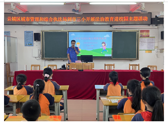 为进一步增强师生规范投放垃圾意识,促进学校切实有效做好垃圾分类工作,2023年9月15日上午,区城市执法局会同区垃圾分类办到市三小开展习近平法治思想及《云浮市生活垃圾分类管理条例》进校园宣传教育主题活动。